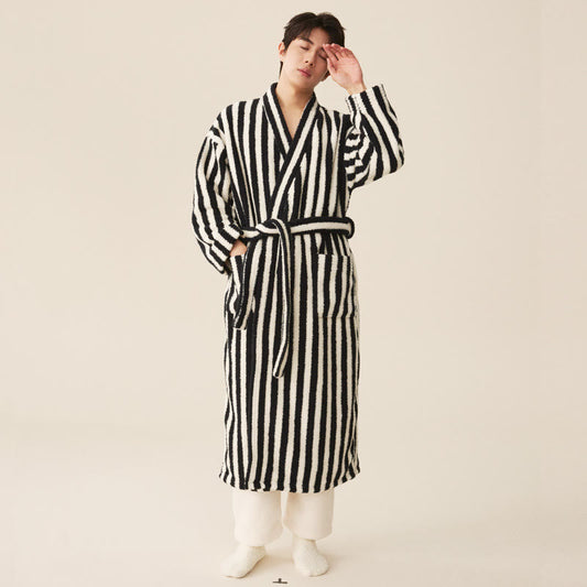 Ownkoti Men's Winter Fleece Cozy Stripe Long Bathrobe for Ultimate Comfort