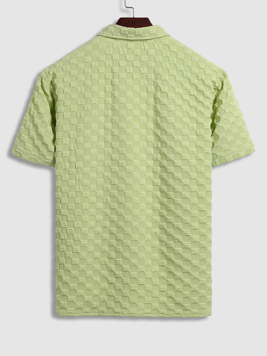 Men's polo shirt with a plain plaid pattern, textured collar, and short sleeves
