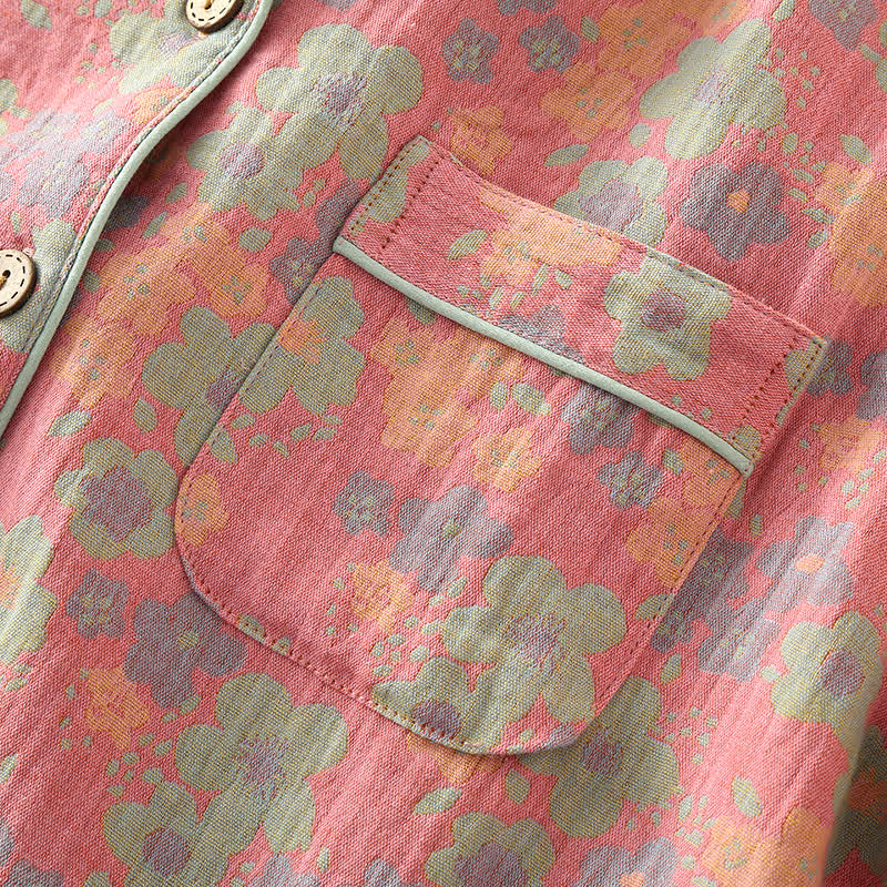 This loungewear set with plum blossoms is unique and can make you look attractive even when you're at home. If you are looking for a cotton loungewear set, this set is an excellent choice. Made from pure cotton with double-layer gauze, it is soft, comfortable, and lightweight, ensuring a relaxed fit and freedom of movement. Featuring environmentally friendly reactive printing and jacquard technology, the colors are vibrant and not easy to fade.