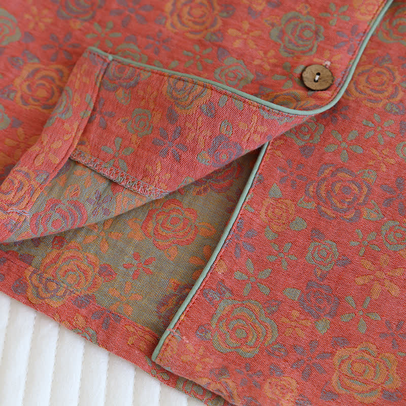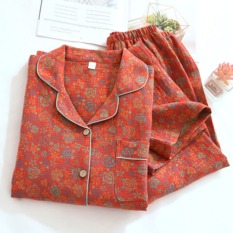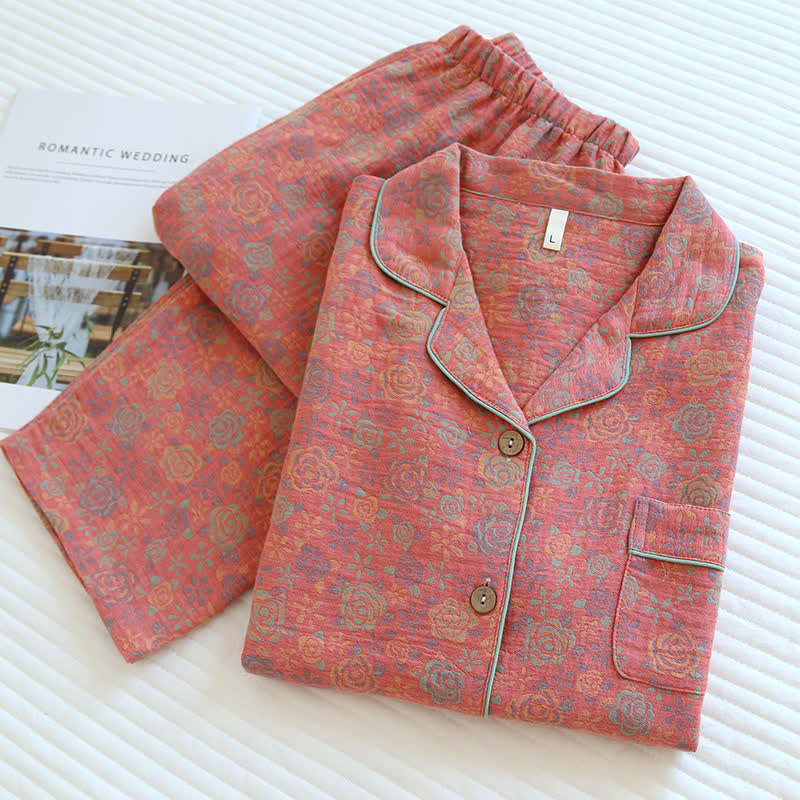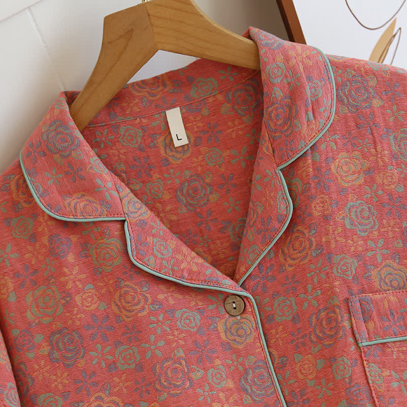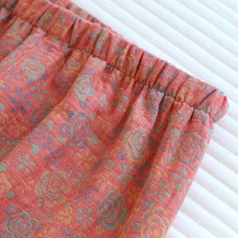 This rose-patterned loungewear is the epitome of elegance and luxury. Made from pure cotton, it is ultra-soft, breathable, and more comfortable than ordinary materials, offering you an optimal cozy wearing experience. The elastic waistband of the trousers allows you to adjust the fit according to your body shape. The pastoral floral loungewear set adds an exquisite touch for you. Allow yourself to feel extremely comfortable while lounging or sleeping. Suitable for autumn, winter, and spring, it is an excellent choice for indoor wear.